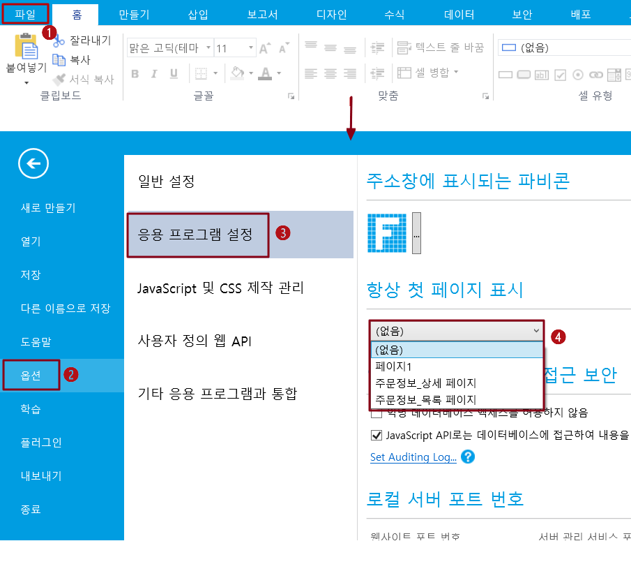 방법2. 페이지를 열고 속성 설정 영역의 페이지 설정에서 시작 페이지로 설정을 선택합니다.