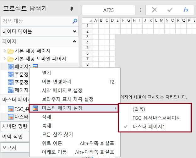 페이지를 선택하고 마스터 페이지 설정을 마우스 오른쪽 버튼을 클릭하고 팝업 마스터 페이지 목록에서 마스터 페이지를 선택하여 적용합니다.