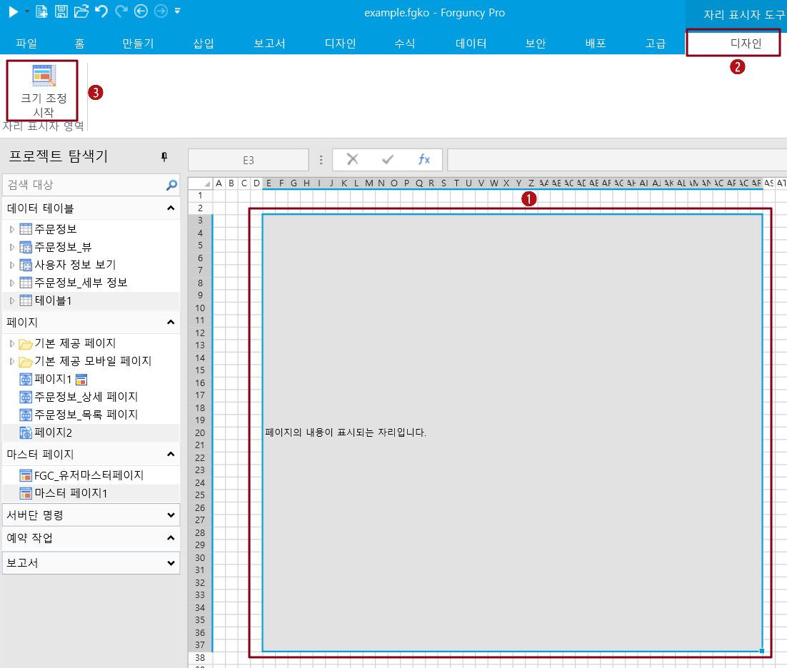 마스터 페이지를 열고 페이지 자리 표시를 선택한 다음 기능 메뉴 모음에서 [디자인]>[크기 조정 시작]을 선택합니다.