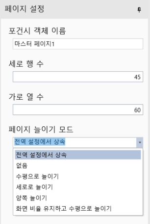 여기서 전역 설정에서 상속된 이 페이지의 늘이기 모드는 [파일]>[옵션]>[응용 프로그램 설정]>[페이지 늘이기 모드] 설정과 동일합니다.