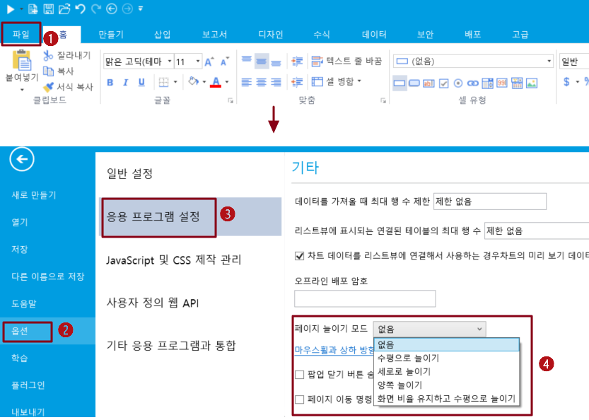 [파일]>[옵션]>[응용 프로그램 설정]>[페이지 늘이기 모드]를 설정합니다.