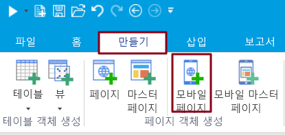 방법 1. 리본 메뉴에서 [만들기]>[모바일 페이지]를 선택합니다.