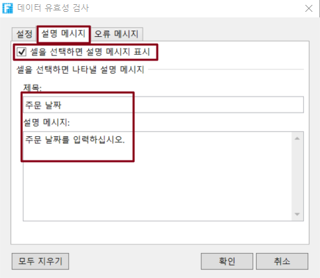 [설명 메시지]를 선택하여 셀을 선택할 때 표시되는 입력 정보를 설정합니다. 셀을 선택할 때 입력 정보 표시를 선택하지 않으면 입력 정보가 표시되지 않습니다.