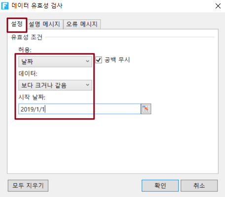 데이터의 유효성 검사 조건 설정: 허용되는 숫자 유형 및 데이터입니다.