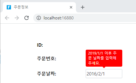 실행 후 주문을 추가하면 주문 날짜 셀에서 날짜를 선택할 때 설정된 입력 정보가 표시됩니다. 2019/1/1보다 작은 날짜를 선택한 후 다음 정보를 입력하면 오류 경고가 빨간색으로 표시됩니다.