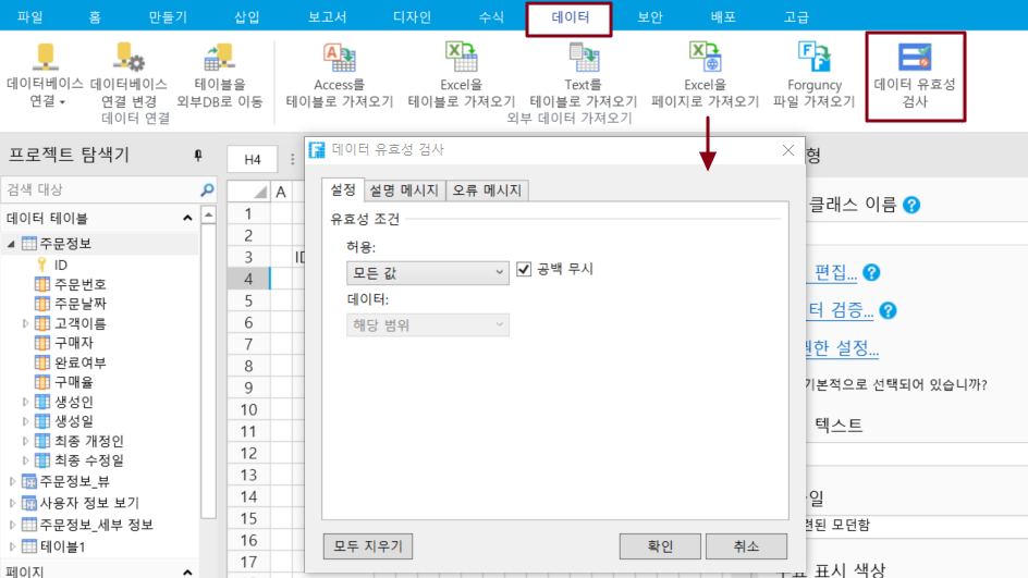 포건시의 데이터 유효성 검사는 Excel의 데이터 유효성 검사와 유사합니다. 차이점은 두 가지입니다.