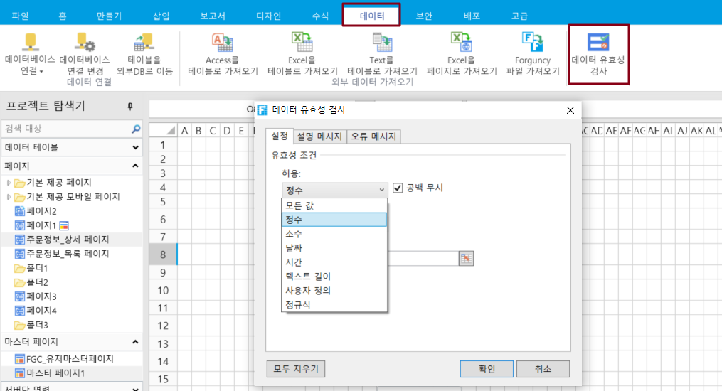 포건시에서 데이터 유효성 검사를 사용하여 정수, 소수, 날짜 및 텍스트 길이에 대한 숫자 확인과 같은 데이터 형식 또는 사용자가 입력한 셀의 값을 제한할 수 있습니다.
