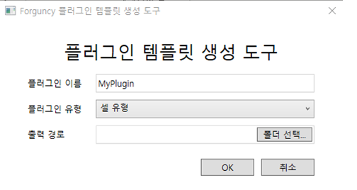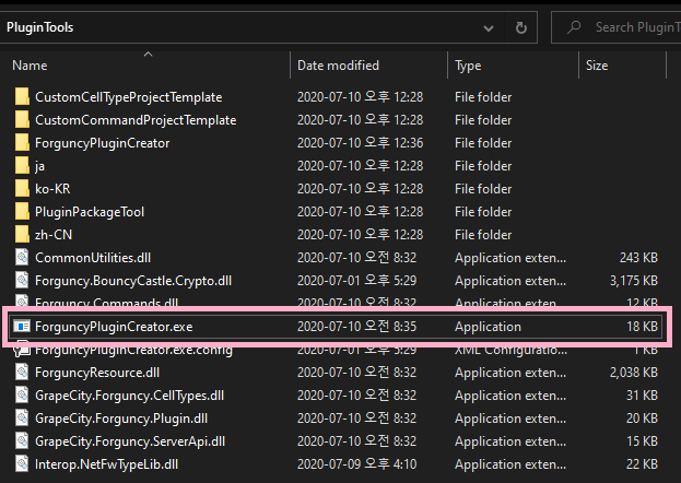 1. [포건시 플러그인 생성 도구 다운로드](https://forguncy-korea.github.io/attached_files/Plugin_Files/etc/PluginTools_20200710.zip)하신 뒤 압축을 풀고, ForguncyPluginCreator.exe를 실행하십시오.