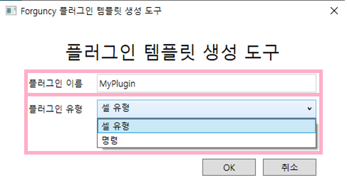 4. 나타나는 실행 창에서 플러그인의 이름을 입력하신 후 플러그인 유형을 선택(셀 유형 혹은 명령 유형)해 주십시오.