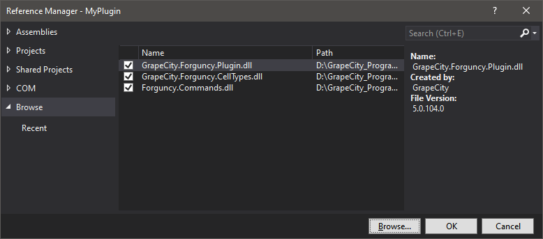 5. 그 후, 3개의 라이브러리 파일 GrapeCity.Forguncy.Plugin.dll, GrapeCity.Forguncy.CellTypes.dll, Forguncy.Commands.dll을 찾아 솔루션 탐색기에 추가하십시오.