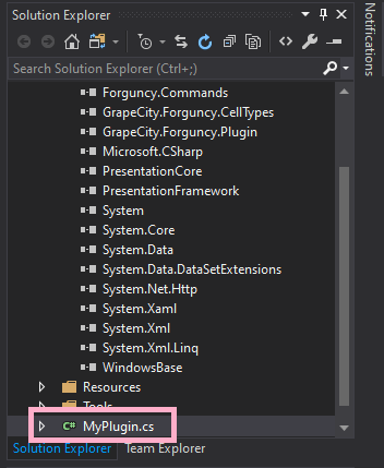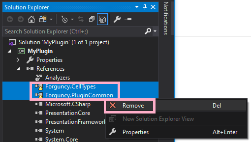 2. VS의 솔루션 탐색기(Solution Explorer)에서 “참고”를 확장하신 후, 나타나는 Forguncy.CellTypes 및 Forguncy.PluginCommon을 제거하십시오.