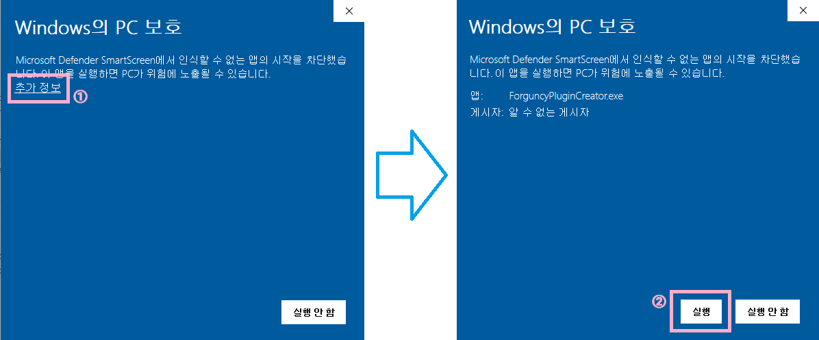 2. 어떤 컴퓨터에서는 아래와 같은 오류 창이 발생할 수 있습니다. 윈도우 내 OS가 가진 인증서와 맞지 않다는 오류이므로, “추가 정보”를 클릭하신 후 “실행”을 클릭하시면 계속 진행됩니다.