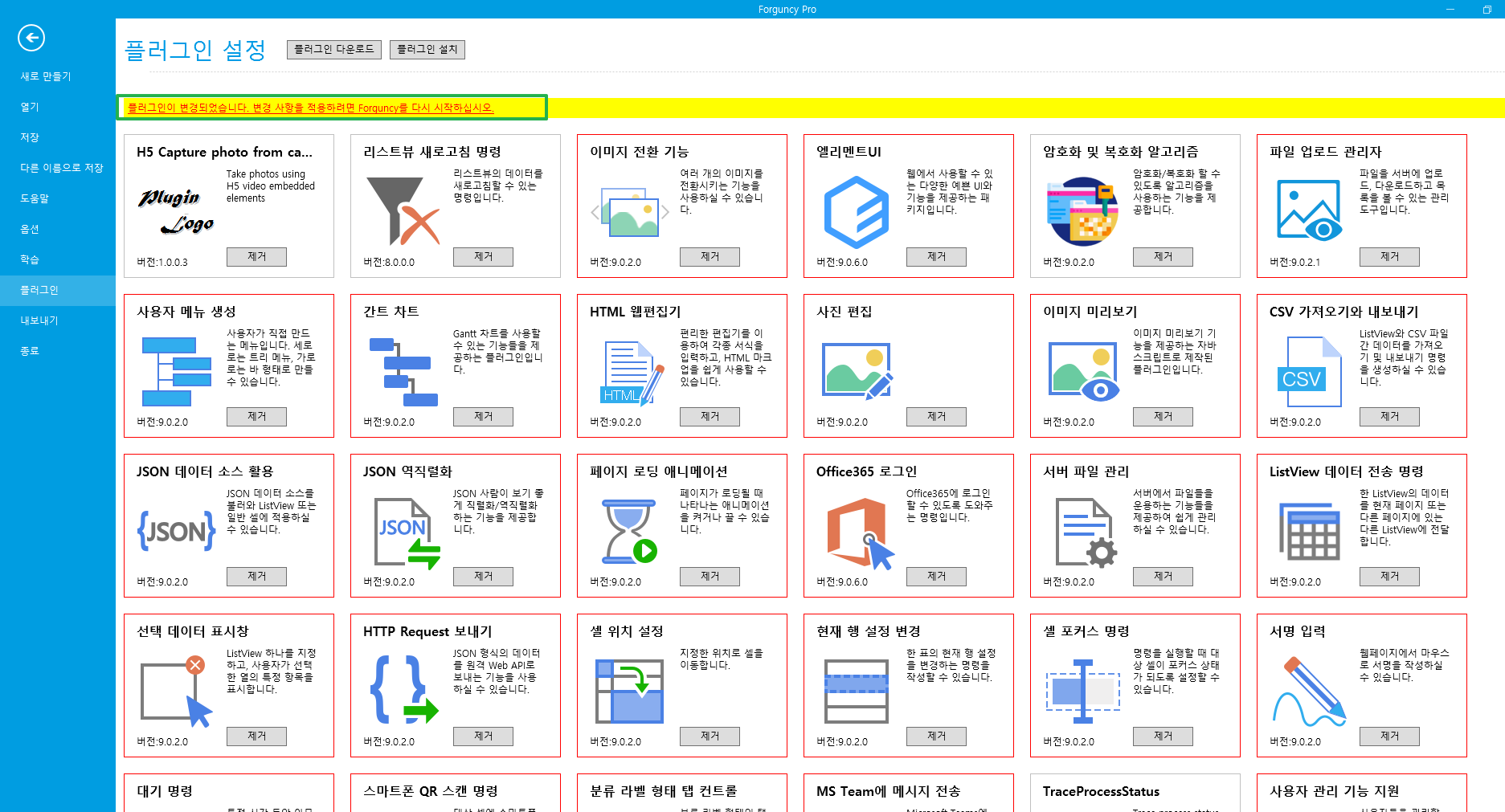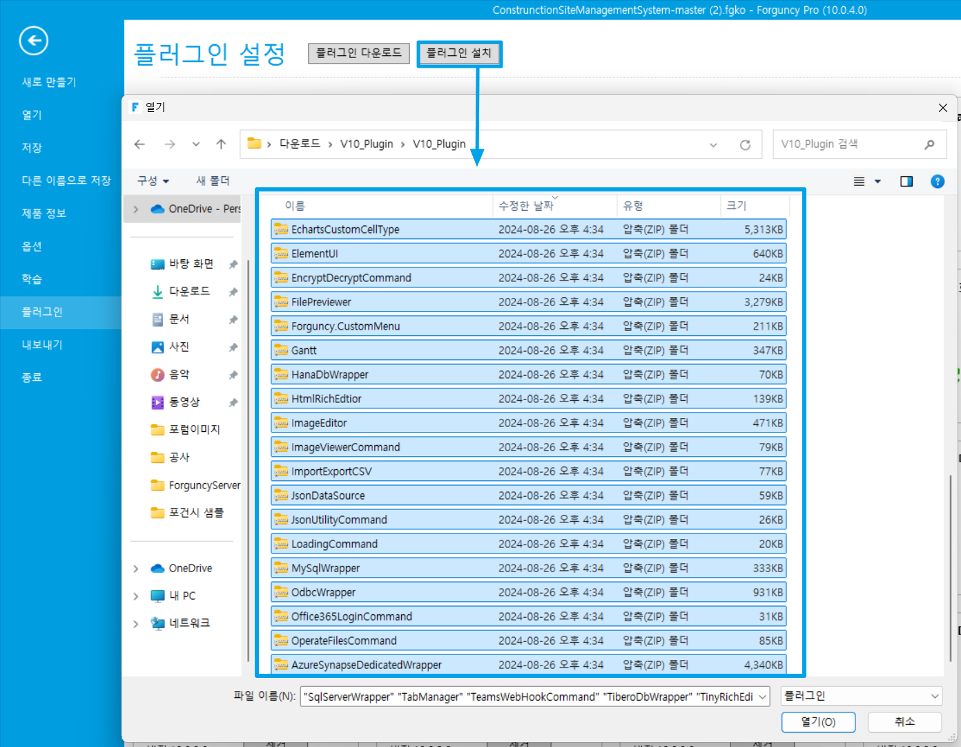 3. 포건시 빌더에서 \[파일>플러그인]에서 \[플러그인 설치]를 클릭한 후, 파일탐색창에서2번에서 압축 해지한 플러그인 폴더를 열고 플러그인을 전체 선택한 후 \[열기]를 클릭합니다.<br>