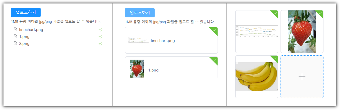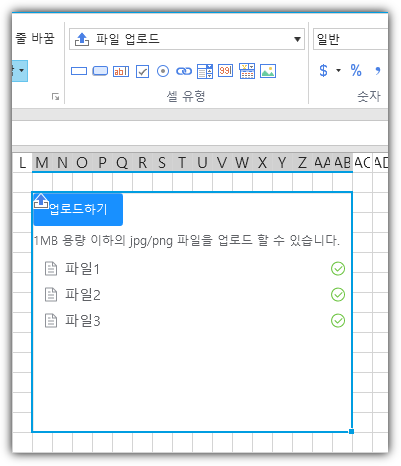 이 업로드 셀 유형에서는 파일 업로드/다운로드를 사용할 수 있습니다. 다음과 같은 세 가지 디스플레이 모드를 지원합니다.