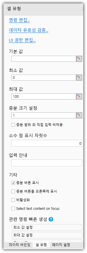 <table><thead><tr><th width="324">이름 </th><th>설명 </th></tr></thead><tbody><tr><td>명령 편집</td><td>값이 변경될 때 실행할 명령 구성</td></tr><tr><td>데이터 유효성 검사</td><td>셀의 구성 데이터 유효성 검사, 업데이트 명령 실행 또는 요청 서버 명령 실행 시에만 유효성 검사</td></tr><tr><td>UI 권한 편집 </td><td>현재 사용자의 역할에 따라 권한 표시/활성화</td></tr><tr><td>기본값</td><td>기본값<br></td></tr><tr><td>최소값 </td><td>입력 가능한 최소값</td></tr><tr><td>최대값 </td><td>입력 가능한 최대값</td></tr><tr><td>증분크기설정 </td><td>실행 시(런타임에서) +, -버튼 클릭 시의 증분 단위</td></tr><tr><td>증분범위와 직접입력 비허용</td><td>체크 시 Step의 정수배가 아닌 값 입력 지원 안함</td></tr><tr><td>소수점 표시 자릿수</td><td>소수 자릿수</td></tr><tr><td>자리 표시자</td><td>텍스트가 비어 있을 때만 표시<br><img src="https://grapecity.atlassian.net/wiki/download/thumbnails/2931197263/image2022-2-16_13-57-47.png?version=1&#x26;modificationDate=1644991067247&#x26;cacheVersion=1&#x26;api=v2&#x26;width=237&#x26;height=57" alt=""></td></tr><tr><td>증분버튼표시</td><td>컨트롤 표시 또는<br>True 가 아님을 나타냅니다.<br><img src="https://grapecity.atlassian.net/wiki/download/attachments/2931197263/image2022-2-16_13-52-48.png?version=1&#x26;modificationDate=1644990768393&#x26;cacheVersion=1&#x26;api=v2" alt=""><br>거짓<br><img src="https://grapecity.atlassian.net/wiki/download/thumbnails/2931197263/image2022-2-16_13-59-2.png?version=1&#x26;modificationDate=1644991142990&#x26;cacheVersion=1&#x26;api=v2&#x26;width=246&#x26;height=54" alt=""></td></tr><tr><td>증분버튼을 오른쪽에 표시</td><td>컨트롤 표시를 스핀 버튼으로 표시하거나<br>True 가 아님<br><img src="https://grapecity.atlassian.net/wiki/download/thumbnails/2931197263/image2022-2-16_14-0-45.png?version=1&#x26;modificationDate=1644991245297&#x26;cacheVersion=1&#x26;api=v2&#x26;width=242&#x26;height=55" alt=""><br>거짓<br><img src="https://grapecity.atlassian.net/wiki/download/attachments/2931197263/image2022-2-16_13-52-48.png?version=1&#x26;modificationDate=1644990768393&#x26;cacheVersion=1&#x26;api=v2" alt=""></td></tr><tr><td>비활성화</td><td><img src="https://grapecity.atlassian.net/wiki/download/thumbnails/2931197263/image2022-2-16_14-26-7.png?version=1&#x26;modificationDate=1644992768083&#x26;cacheVersion=1&#x26;api=v2&#x26;width=263&#x26;height=60" alt=""></td></tr></tbody></table>