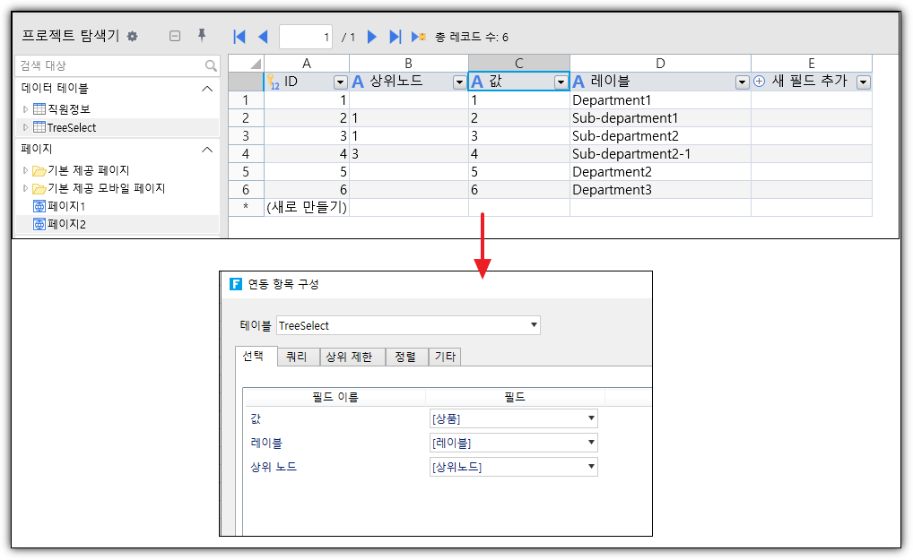테이블 JSON 객체 트리를 셀의 데이터 소스로 사용하는 JSON 형식 예제는 [ {"value": 1, "label": "Department1", "parentValue": null}, {"value": 2, "label": "Department1-1", "parentValue": 1}, {"value": 3, "label": "Department1-2", "parentValue": 1}, {"value": 4, "label" ": "Department1-2-1", "parentValue": 3}, {"value": 5, "label": "Department2", "parentValue": null}, {"value": 6, "label": "부서3", "부모값":null} ] 위의 데이터는 'value 속성'을 value, 'label 속성명'을 label, '상위값 속성명'을 'parentValue'로 가정하고 있다 . 데이터베이스