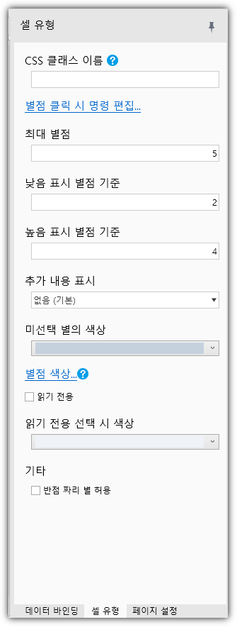 | 읽기 전용         | 최종 사용자가 별점을 변경할 수 있는지 여부                                                                                                                                                                                                                                                                                                                                                                                                                                                                                                                                                                                                                                                                                                          |