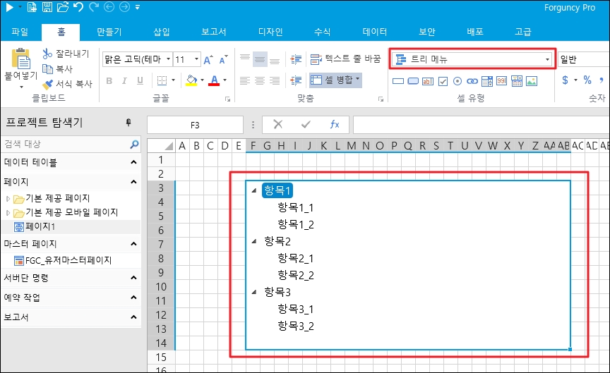 셀 범위를 선택하고 해당 셀 유형을 트리 메뉴로 설정합니다.