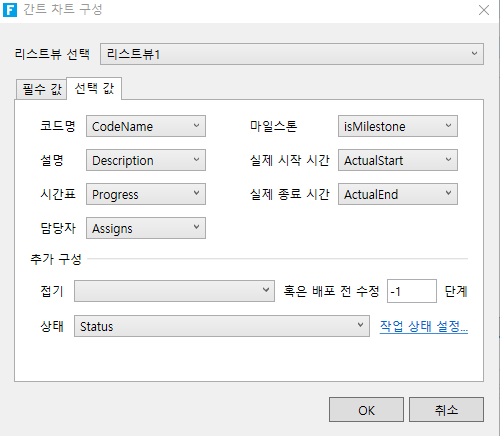 &#x20;    3\) 간트차트구성 대화상자에서 아래와 같이 설정합니다.&#x20;