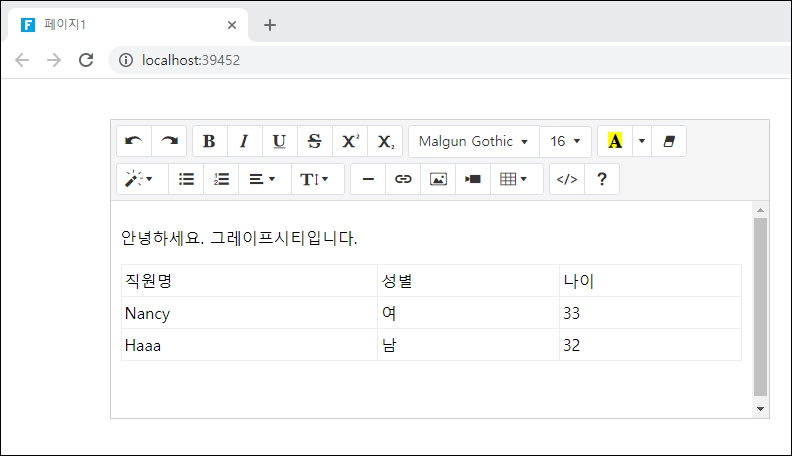 HtmlRichEditor 플러그인을 사용하여 형식, 글꼴, 글꼴 크기, 배경색, 표, 등 을 사용할 수 있습니다.