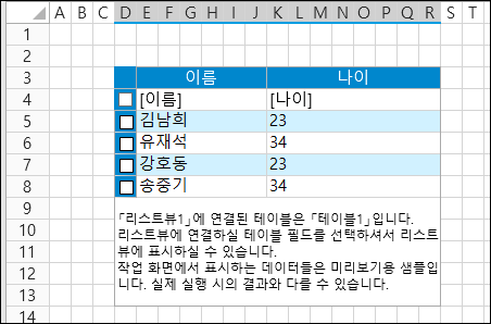 4\. 셀 범위를 선택하고 해당 셀 유형을 ListView 선택 항목 표시기로 설정합니다.