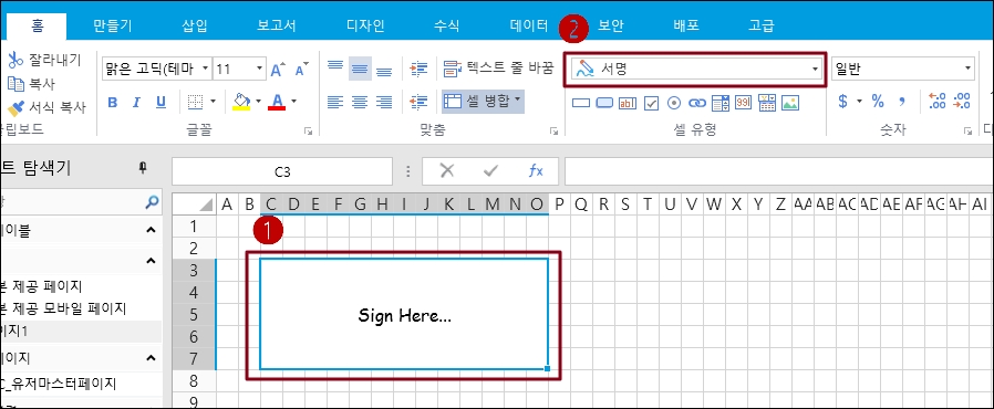 셀영역을 선택하고 셀 유형을 서명으로 설정합니다.