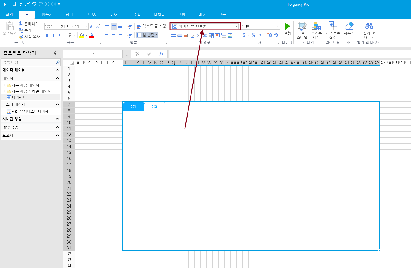 3\. 셀 영역을 선택하고, 셀 유형 "페이지 탭 컨트롤"로 설정합니다.