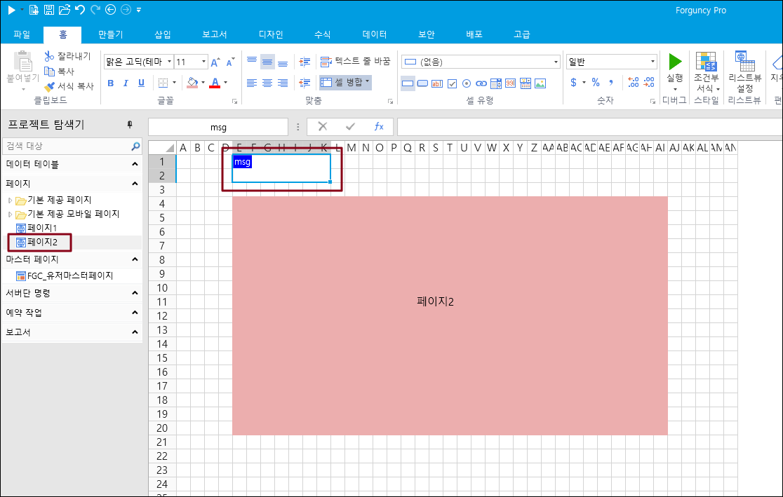 4-1) "페이지2"라는 이름의 페이지를 추가한 후, 페이지 2에서 셀 영역에 "msg"라고 셀이름을 설정합니다.