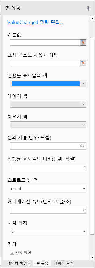 <table><thead><tr><th width="281">이름 </th><th>설명 </th></tr></thead><tbody><tr><td>변경된 값 편집 명령</td><td>셀 값이 변경될 때 명령이 실행되도록 구성</td></tr><tr><td>기본값</td><td>기본값</td></tr><tr><td>표시 텍스트 사용자 정의</td><td>표시 텍스트 사용자 정의</td></tr><tr><td>진행률 표시줄의 색</td><td>진행 색상</td></tr><tr><td>레이어 색</td><td>레이어 색상</td></tr><tr><td>채우기 색</td><td>채우기 색상</td></tr><tr><td>원의 지름 </td><td>원 지름(픽셀)</td></tr><tr><td>진행률 표시줄의 너비</td><td>진행률 표시줄 너비(픽셀)</td></tr><tr><td>스트로크 선 캡</td><td>스트로크 라인 캡, 둥근 사각형 버트 로 설정할 수 있음 </td></tr><tr><td>애니메이션 속도</td><td>애니메이션 속도(속도/초)</td></tr><tr><td>시작 위치</td><td>진행 시작 위치, 다음으로 설정할 수 있습니다. <code>left, right, bottom, top</code></td></tr><tr><td>시계 방향</td><td>시계방향 여부</td></tr></tbody></table>