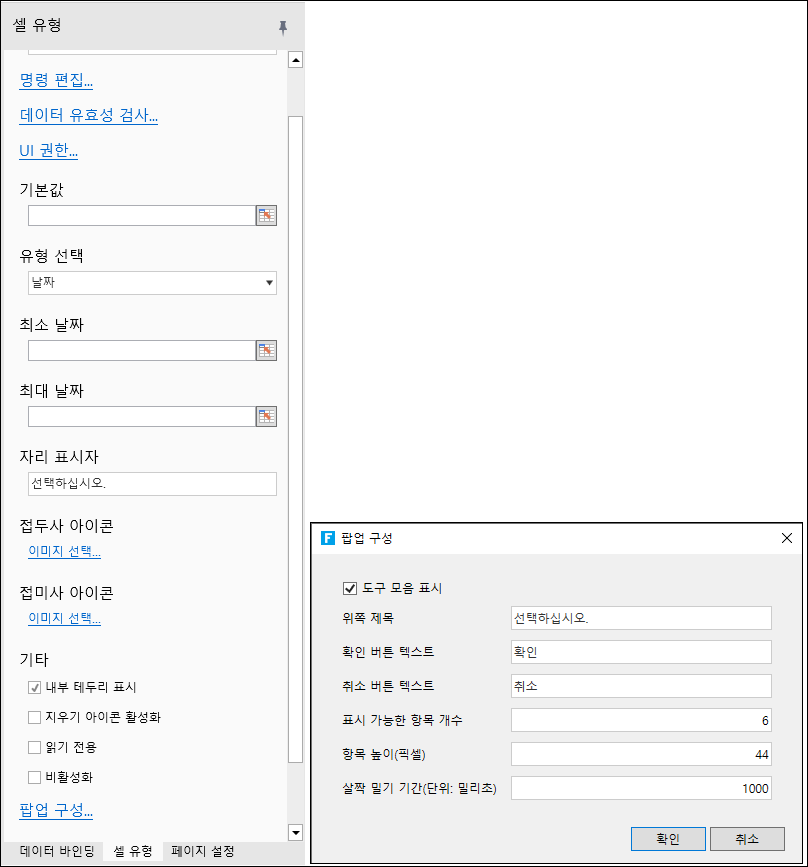 <table><thead><tr><th width="301">이름 </th><th>설명 </th></tr></thead><tbody><tr><td>명령 편집</td><td>값이 변경될 때 실행할 명령 구성</td></tr><tr><td>데이터 유효성 검사</td><td>셀의 구성 데이터 유효성 검사, 업데이트 명령 실행 또는 요청 서버 명령 실행 시에만 유효성 검사</td></tr><tr><td>UI 권한</td><td>현재 사용자의 역할에 따라 표시/편집 가능/활성화 권한</td></tr><tr><td>기본값</td><td>기본값</td></tr><tr><td>유형 선택</td><td><p>날짜 : yyyy MM dd</p><p><img src="https://grapecity.atlassian.net/wiki/download/attachments/2931197626/image2022-3-28_14-38-7.png?version=1&#x26;modificationDate=1648449487893&#x26;cacheVersion=1&#x26;api=v2" alt=""></p><p>년-월 : yyyy MM</p><p><img src="https://grapecity.atlassian.net/wiki/download/attachments/2931197626/image2022-3-28_14-38-58.png?version=1&#x26;modificationDate=1648449539153&#x26;cacheVersion=1&#x26;api=v2" alt=""></p><p>월-일 : MM dd</p><p><img src="https://grapecity.atlassian.net/wiki/download/attachments/2931197626/image2022-3-28_14-39-34.png?version=1&#x26;modificationDate=1648449574980&#x26;cacheVersion=1&#x26;api=v2" alt=""></p><p>날짜-시간 : yyyy MM dd HH</p><p><img src="https://grapecity.atlassian.net/wiki/download/attachments/2931197626/image2022-3-28_14-40-33.png?version=1&#x26;modificationDate=1648449633873&#x26;cacheVersion=1&#x26;api=v2" alt=""></p><p>날짜 시간 : yyyy MM dd HH mm</p><p><img src="https://grapecity.atlassian.net/wiki/download/attachments/2931197626/image2022-3-28_14-41-17.png?version=1&#x26;modificationDate=1648449677843&#x26;cacheVersion=1&#x26;api=v2" alt=""></p><p>시간 : HH mm</p><p><img src="https://grapecity.atlassian.net/wiki/download/attachments/2931197626/image2022-3-28_14-42-5.png?version=1&#x26;modificationDate=1648449725527&#x26;cacheVersion=1&#x26;api=v2" alt=""></p></td></tr><tr><td>최소 날짜</td><td>최소 날짜</td></tr><tr><td>최대 날짜</td><td>최대 날짜</td></tr><tr><td>최소 시간</td><td> 유형 의 최소 시간<code>time</code> </td></tr><tr><td>최대 시간</td><td> 유형 의 최대 시간<code>time</code> </td></tr><tr><td>최소 분</td><td> 유형 의 최소 분<code>time</code> </td></tr><tr><td>최대 분</td><td> 유형 의 최대 분<code>time</code> </td></tr><tr><td>자리 표시자</td><td>자리 표시자</td></tr><tr><td>접두사 아이콘</td><td><img src="https://grapecity.atlassian.net/wiki/download/thumbnails/2931197626/image2022-3-28_14-49-46.png?version=1&#x26;modificationDate=1648450186140&#x26;cacheVersion=1&#x26;api=v2&#x26;width=250&#x26;height=72" alt=""></td></tr><tr><td>접미사 아이콘</td><td><img src="https://grapecity.atlassian.net/wiki/download/thumbnails/2931197626/image2022-3-28_14-50-12.png?version=1&#x26;modificationDate=1648450212700&#x26;cacheVersion=1&#x26;api=v2&#x26;width=252&#x26;height=58" alt=""></td></tr><tr><td>내부 테두리 표시</td><td><img src="https://grapecity.atlassian.net/wiki/download/thumbnails/2931197626/image2022-3-28_14-51-39.png?version=1&#x26;modificationDate=1648450299533&#x26;cacheVersion=1&#x26;api=v2&#x26;width=300&#x26;height=70" alt=""></td></tr><tr><td>지우기 아이콘 활성화</td><td>접미사 지우기 아이콘 표시 여부</td></tr><tr><td>읽기 전용</td><td><br></td></tr><tr><td>비활성화</td><td><br></td></tr><tr><td>팝업 구성</td><td><p>도구 모음 표시: 팝업에 상단 표시줄 표시 여부를 결정합니다.</p><p><img src="https://grapecity.atlassian.net/wiki/download/attachments/2931197626/image2022-3-28_14-54-11.png?version=1&#x26;modificationDate=1648450451710&#x26;cacheVersion=1&#x26;api=v2" alt=""></p><p>위쪽 제목</p><p><img src="https://grapecity.atlassian.net/wiki/download/attachments/2931197626/image2022-3-28_14-54-26.png?version=1&#x26;modificationDate=1648450466523&#x26;cacheVersion=1&#x26;api=v2" alt=""></p><p>확인 버튼 텍스트 </p><p><img src="https://grapecity.atlassian.net/wiki/download/attachments/2931197626/image2022-3-28_14-54-50.png?version=1&#x26;modificationDate=1648450490847&#x26;cacheVersion=1&#x26;api=v2" alt=""></p><p>취소 버튼 텍스트</p><p><img src="https://grapecity.atlassian.net/wiki/download/attachments/2931197626/image2022-3-28_14-55-6.png?version=1&#x26;modificationDate=1648450506737&#x26;cacheVersion=1&#x26;api=v2" alt=""></p><p>표시 가능한 항목 개수 : 보이는 열의 개수 </p><p>항목 높이(픽셀): 항목 높이</p><p>살짝 밀기 기간 : 모멘텀 애니메이션의 지속 시간, 단위  ms</p></td></tr></tbody></table>