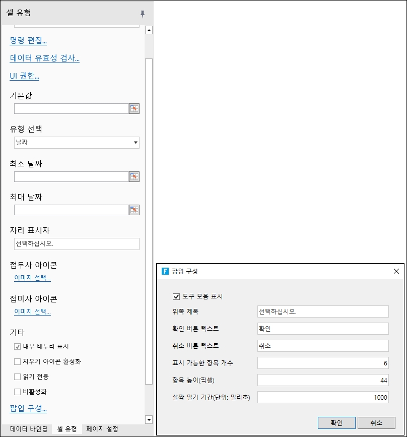 셀의 구성 데이터 유효성 검사, 업데이트 명령 실행 또는 요청 서버 명령 실행 시에만 유효성 검사