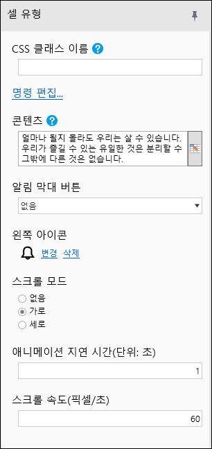 | 스크롤 모드      | <p>없음 : 스크롤하지 않음</p><p>가로 : 가로로 스크롤</p><p>세로 : 세로 스크롤</p> |
