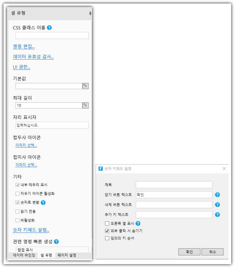 <table><thead><tr><th width="307">이름 </th><th>설명 </th></tr></thead><tbody><tr><td>명령 편집</td><td>값이 변경될 때 실행할 명령 구성</td></tr><tr><td>데이터 유효성 검사</td><td>셀의 구성 데이터 유효성 검사, 업데이트 명령 실행 또는 요청 서버 명령 실행 시에만 유효성 검사</td></tr><tr><td>UI 권한</td><td>현재 사용자의 역할에 따라 권한 표시/활성화</td></tr><tr><td>기본값</td><td>기본값</td></tr><tr><td>최대 길이</td><td>입력 숫자의 최대 길이</td></tr><tr><td>자리 표시자</td><td>자리 표시자</td></tr><tr><td>접두사 아이콘</td><td>텍스트 상자의 접두사 아이콘</td></tr><tr><td>접미사 아이콘 </td><td>텍스트 상자의 접미사 아이콘</td></tr><tr><td>내부 테두리 표시</td><td>하단 테두리 표시 여부 결정</td></tr><tr><td>지우기 아이콘 활성화</td><td>텍스트 상자의 모든 콘텐츠를 지울 수 있는 접미사 지우기 아이콘 표시 여부 결정</td></tr><tr><td>숫자로 변환</td><td>입력 텍스트를 숫자로 변환할지 여부 결정</td></tr><tr><td>읽기 전용</td><td>수정이  불가능하고 읽을 수만 있음 <br></td></tr><tr><td>비활성화 </td><td>비활성화 <br></td></tr><tr><td>숫자 키패드 설정</td><td><p>제목: 키패드 제목</p><p><img src="https://grapecity.atlassian.net/wiki/download/attachments/2931197517/image2022-3-28_11-24-21.png?version=1&#x26;modificationDate=1648437862080&#x26;cacheVersion=1&#x26;api=v2" alt=""></p><p>닫기 버튼 텍스트</p><p><img src="https://grapecity.atlassian.net/wiki/download/attachments/2931197517/image2022-3-28_11-25-40.png?version=1&#x26;modificationDate=1648437940333&#x26;cacheVersion=1&#x26;api=v2" alt=""></p><p>삭제 버튼 텍스트 </p><p><img src="https://grapecity.atlassian.net/wiki/download/thumbnails/2931197517/image2022-3-28_11-26-33.png?version=1&#x26;modificationDate=1648437993507&#x26;cacheVersion=1&#x26;api=v2&#x26;width=326&#x26;height=221" alt=""></p><p>추가 키 텍스트</p><p><img src="https://grapecity.atlassian.net/wiki/download/thumbnails/2931197517/image2022-3-28_11-27-52.png?version=1&#x26;modificationDate=1648438072990&#x26;cacheVersion=1&#x26;api=v2&#x26;width=325&#x26;height=224" alt=""></p><p>오른쪽 열 표시: 오른쪽 열이 표시되면 두 개의 추가 키를 구성할 수 있습니다.</p><p><img src="https://grapecity.atlassian.net/wiki/download/thumbnails/2931197517/image2022-3-28_11-32-58.png?version=1&#x26;modificationDate=1648438378823&#x26;cacheVersion=1&#x26;api=v2&#x26;width=496&#x26;height=250" alt=""></p><p>외부 클릭 시 숨기기: 이 옵션을 선택하면 외부를 클릭할 때 키패드가 숨겨집니다.</p><p>임의의 키 순서: 체크하면 키 순서가 랜덤이 됩니다.</p></td></tr></tbody></table>
