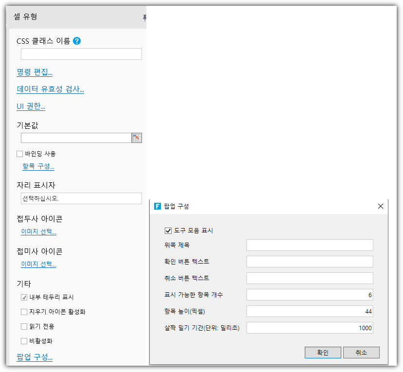<table><thead><tr><th width="284">이름 </th><th>설명 </th></tr></thead><tbody><tr><td>명령 편집</td><td>값이 변경될 때 실행할 명령 구성</td></tr><tr><td>데이터 유효성 검사</td><td>셀의 구성 데이터 유효성 검사, 업데이트 명령 실행 또는 요청 서버 명령 실행 시에만 유효성 검사</td></tr><tr><td>UI 권한</td><td>현재 사용자의 역할에 따라 표시/편집 가능/활성화 권한</td></tr><tr><td>기본값</td><td>기본값</td></tr><tr><td>바인딩 사용</td><td>항목이 데이터베이스에서 바인딩되는지 여부를 나타냅니다 <br>. 항목이 데이터베이스에서 온 경우 선택기는 중복 항목을 자동으로 제거합니다. <br></td></tr><tr><td>항목 구성 </td><td>디자인 타임에 바인딩 해제 항목 구성</td></tr><tr><td>바인딩 항목 구성 </td><td>구성 바인딩 항목. 구성 값/레이블 열, 필터, 정렬, 상단/오프셋 및 캐시 허용</td></tr><tr><td>자리 표시자</td><td>텍스트 상자 자리 표시자</td></tr><tr><td>접두사 아이콘</td><td><img src="https://grapecity.atlassian.net/wiki/download/thumbnails/2931197565/image2022-3-28_13-37-55.png?version=1&#x26;modificationDate=1648445876463&#x26;cacheVersion=1&#x26;api=v2&#x26;width=215&#x26;height=60" alt=""></td></tr><tr><td>접미사 아이콘</td><td><img src="https://grapecity.atlassian.net/wiki/download/thumbnails/2931197565/image2022-3-28_13-38-18.png?version=1&#x26;modificationDate=1648445899333&#x26;cacheVersion=1&#x26;api=v2&#x26;width=189&#x26;height=68" alt=""></td></tr><tr><td>내부 테두리 표시</td><td><img src="https://grapecity.atlassian.net/wiki/download/thumbnails/2931197565/image2022-3-28_13-39-5.png?version=1&#x26;modificationDate=1648445945593&#x26;cacheVersion=1&#x26;api=v2&#x26;width=209&#x26;height=66" alt=""></td></tr><tr><td>지우기 아이콘 활성화</td><td><p>선택한 항목이 비어 있지 않을 때 접미사 지우기 아이콘을 표시할지 여부를 결정합니다.</p><p><img src="https://grapecity.atlassian.net/wiki/download/thumbnails/2931197565/image2022-3-28_13-50-54.png?version=1&#x26;modificationDate=1648446655073&#x26;cacheVersion=1&#x26;api=v2&#x26;width=208&#x26;height=64" alt=""></p></td></tr><tr><td>읽기 전용</td><td>읽기 전용<br></td></tr><tr><td>비활성화 </td><td>비활성화 </td></tr><tr><td>팝업 구성</td><td><p>도구 모음 표시: 팝업에 상단 표시줄 표시 여부를 결정합니다.</p><p><img src="https://grapecity.atlassian.net/wiki/download/thumbnails/2931197565/image2022-3-28_13-52-13.png?version=1&#x26;modificationDate=1648446733743&#x26;cacheVersion=1&#x26;api=v2&#x26;width=281&#x26;height=250" alt=""></p><p>위쪽 제목</p><p><img src="https://grapecity.atlassian.net/wiki/download/thumbnails/2931197565/image2022-3-28_13-54-3.png?version=1&#x26;modificationDate=1648446843307&#x26;cacheVersion=1&#x26;api=v2&#x26;width=293&#x26;height=250" alt=""></p><p>확인 버튼 텍스트 </p><p><img src="https://grapecity.atlassian.net/wiki/download/thumbnails/2931197565/image2022-3-28_13-54-35.png?version=1&#x26;modificationDate=1648446875893&#x26;cacheVersion=1&#x26;api=v2&#x26;width=287&#x26;height=250" alt=""></p><p>취소 버튼 텍스트</p><p><img src="https://grapecity.atlassian.net/wiki/download/thumbnails/2931197565/image2022-3-28_13-55-9.png?version=1&#x26;modificationDate=1648446909897&#x26;cacheVersion=1&#x26;api=v2&#x26;width=291&#x26;height=250" alt=""></p><p>표시 가능한 항목 개수: 보이는 열의 개수</p><p>항목 높이(픽셀): 항목 높이</p><p>살짝 밀기 기간 : 모멘텀 애니메이션의 지속 시간, 단위 ms</p></td></tr></tbody></table>