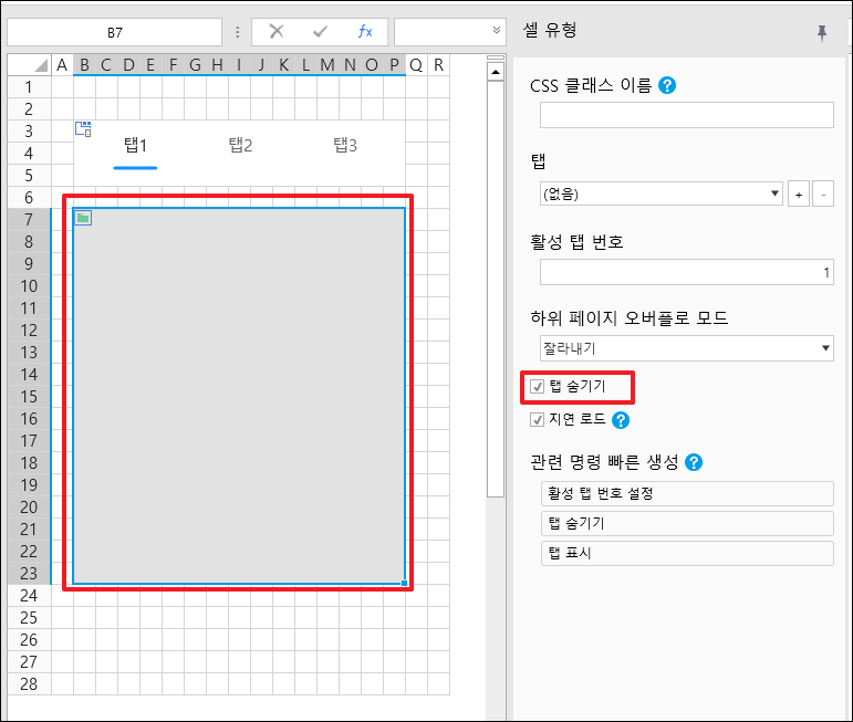 3. 페이지 내 탭 방식 셀의 기본 헤더를 숨기려면 탭 숨기기에 체크합니다.&#x20;
