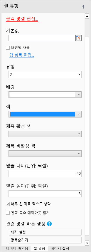 <table><thead><tr><th width="258">이름 </th><th>설명 </th></tr></thead><tbody><tr><td>클릭 명령 편집</td><td>탭을 클릭할 때 실행할 명령 구성</td></tr><tr><td>기본값</td><td>탭 번호(1부터 시작)</td></tr><tr><td>바인딩 사용</td><td>바인딩된 테이블을 사용하여 구성 탭 항목 세부 정보</td></tr><tr><td>탭 항목 편집</td><td>구성 탭 항목 세부 정보</td></tr><tr><td>유형</td><td><p>선</p><p><img src="https://grapecity.atlassian.net/wiki/download/thumbnails/2931197717/image2022-3-28_16-27-6.png?version=1&#x26;modificationDate=1648456027000&#x26;cacheVersion=1&#x26;api=v2&#x26;width=217&#x26;height=63" alt=""></p><p>카드</p><p><img src="https://grapecity.atlassian.net/wiki/download/thumbnails/2931197717/image2022-3-28_16-28-0.png?version=1&#x26;modificationDate=1648456080397&#x26;cacheVersion=1&#x26;api=v2&#x26;width=238&#x26;height=68" alt=""></p></td></tr><tr><td>배경</td><td>배경색</td></tr><tr><td>색</td><td>탭 색상</td></tr><tr><td>제목 활성 색</td><td>제목 활성 색상</td></tr><tr><td>제목 비활성 색</td><td>제목 비활성 색상</td></tr><tr><td>밑줄 너비</td><td>밑줄 너비(픽셀)</td></tr><tr><td>밑줄 높이</td><td>밑줄 높이(픽셀)</td></tr><tr><td>너무 긴 제목 텍스트 생략</td><td>너무 긴 제목 생략 여부</td></tr><tr><td>왼쪽 축소 레이아웃 열기</td><td>탭을 왼쪽으로 축소할지 여부</td></tr></tbody></table>