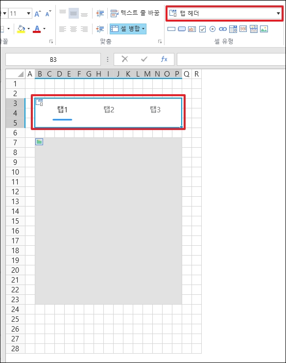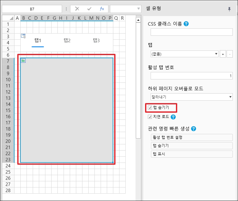 페이지 내 탭 방식 셀의 기본 헤더를 숨기려면 탭 숨기기에 체크합니다.