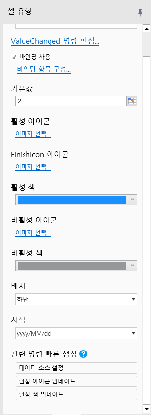 <table><thead><tr><th width="260">이름 </th><th>설명 </th></tr></thead><tbody><tr><td>변경된 값 편집 명령</td><td>셀 값이 변경될 때 명령이 실행되도록 구성</td></tr><tr><td>기본값</td><td>기본값</td></tr><tr><td>바인딩 사용</td><td>단계 항목이 데이터베이스에서 바인딩되는지 여부를 나타냅니다. </td></tr><tr><td>노드 항목 구성 </td><td>디자인 타임에 바인딩 해제 단계 항목 구성</td></tr><tr><td>바인딩 항목 구성 </td><td>구성 바인딩 단계 항목. 구성 값/제목 열, 필터, 정렬, 상단/오프셋 및 캐시 허용</td></tr><tr><td>활성 아이콘</td><td>활성 아이콘</td></tr><tr><td>비활성 아이콘</td><td>비활성 아이콘</td></tr><tr><td>비활성 색상</td><td>비활성 색상뱇</td></tr><tr><td>배치</td><td><p>타임스탬프의 위치, 하단, 상단으로 설정 가능</p><p>하단 </p><p><img src="https://grapecity.atlassian.net/wiki/download/thumbnails/2931197724/image2022-3-28_17-55-15.png?version=1&#x26;modificationDate=1648461315757&#x26;cacheVersion=1&#x26;api=v2&#x26;width=181&#x26;height=161" alt=""></p><p>상단 </p><p><img src="https://grapecity.atlassian.net/wiki/download/thumbnails/2931197724/image2022-3-28_17-55-32.png?version=1&#x26;modificationDate=1648461332383&#x26;cacheVersion=1&#x26;api=v2&#x26;width=154&#x26;height=147" alt=""></p></td></tr><tr><td>서식 </td><td>타임스탬프 형식 yyyy, yyyy/MM, yyyy/MM/dd, yyyy/MM/dd HH:mm:ss</td></tr></tbody></table>