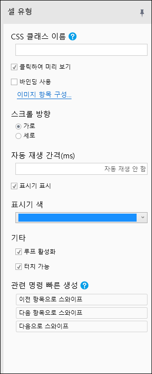 <table><thead><tr><th width="236">이름 </th><th>설명 </th></tr></thead><tbody><tr><td>클릭하여 미리보기</td><td>이미지 클릭 시 미리보기 여부를 결정합니다. 체크하면 사용자가 클릭 명령을 편집할 수 없습니다.</td></tr><tr><td>클릭 명령 편집</td><td>이미지를 클릭할 때 실행할 명령을 구성합니다.</td></tr><tr><td>바인딩 사용</td><td>사용자가 확인할 때 데이터베이스에서 이미지 소스 가져오기, 그렇지 않으면 정적으로 구성</td></tr><tr><td>스크롤 방향</td><td><p>기본값은 가로입니다.</p><p>세로일 때 런타임 페이지는 다음과 같이 표시됩니다.</p><p><img src="https://grapecity.atlassian.net/wiki/download/thumbnails/2931196188/image2022-5-17_9-57-8.png?version=1&#x26;modificationDate=1652752628413&#x26;cacheVersion=1&#x26;api=v2&#x26;width=360&#x26;height=248" alt=""></p></td></tr><tr><td>자동 재생 간격</td><td>단위: ms</td></tr><tr><td>표시기 표시</td><td><img src="https://content.gitbook.com/content/kr3K95OpVnkhRrSKF3Qh/blobs/lw3PTLpYJyO9sqitQLRi/image.png" alt=""><br>표시기 표시 여부 </td></tr><tr><td>표시기 색상</td><td>표시기 표시를 선택하면 효과가 나타납니다.</td></tr><tr><td>루프 활성화</td><td>루프 활성화</td></tr><tr><td>터치가능 </td><td>터치 제스처로 스와이프 허용 여부</td></tr></tbody></table>