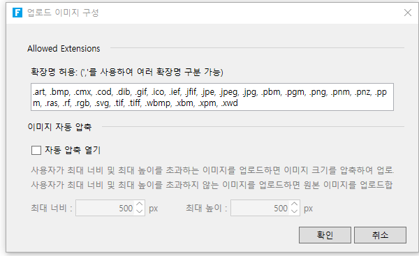 업로드 파일의 확장자를 수락합니다. 기본값은 ".jpg, .jpeg, .png"입니다. 사용자가 잘못된 파일을 업로드하려고 하면 업로드가 실패합니다.