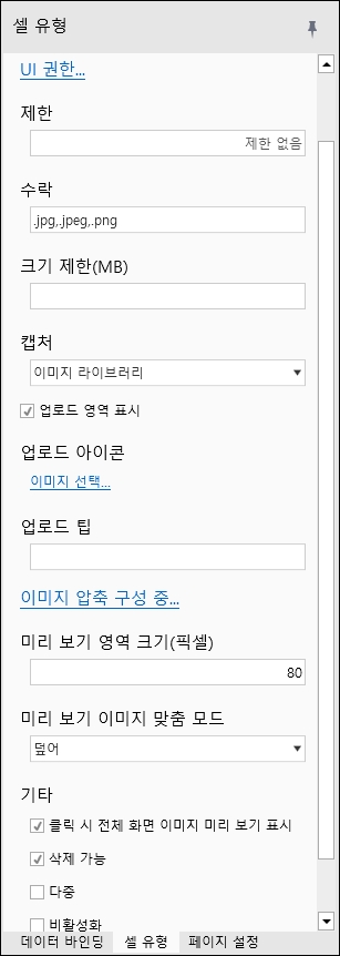업로드할 수 있는 최대 파일 수를 제한합니다. 기본값은 제한이 아닙니다. 사용자가 셀 속성 설정 명령 또는 다중 업로드로 제한보다 많은 파일을 표시하려고 하면 처음 두 파일만 업로드됩니다.
