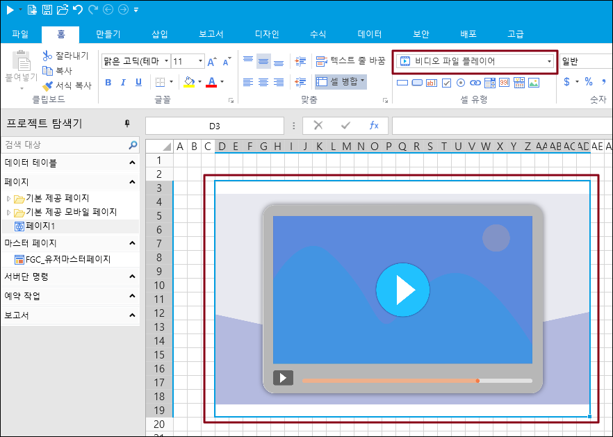 3\. 셀 영역을 선택하고, 셀 유형에서 "비디오 파일 플레이어"를 선택합니다.