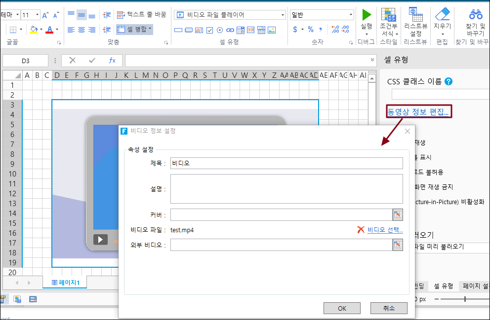4\. 셀 영역을 선택한 후, "동영상 정보 편집"을 클릭합니다.