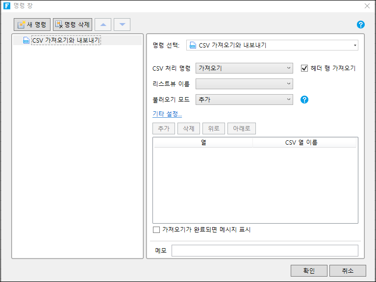 | CSV 처리 명령 | <ul><li>가져오기 : CSV 열 헤더 이름으로 가져오려면 "헤더 행 가져오기"를 선택합니다. 1부터 시작하는 CSV 열 인덱스 값으로 가져오려면 "헤더 행 가져오기"를 선택 취소합니다.</li><li>내보내기 : "헤더 행 가져오기"를 선택하면 열 머리글 이름이 내보내집니다. 열 머리글 이외의 데이터만 내보내려면 "헤더 행 가져오기"를 선택 취소합니다.</li></ul> |