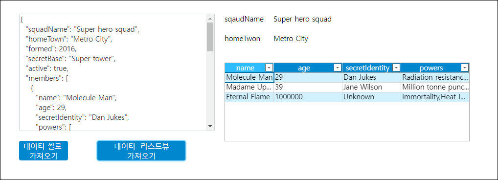 &#x20;"데이터 셀로 가져오기" 와 "데이터 리스트뷰 가져오기" 버튼을 클릭하면 아래와 같이 셀과 리스트뷰에 JSON 데이터를 가져오는 것을 확인할 수 있습니다.&#x20;