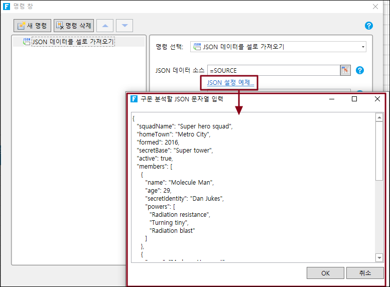 JSON 데이터 소스 가져오기 명령은 JSON의 내용을 리스트뷰나 셀로 추출할 수 있는 플러그인입니다.&#x20;