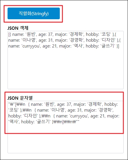 3. 실행을 하고, 직렬화(Stringfy)버튼을 클릭하면 JSON 객체가 문자열로 나오는 것을 확인할 수 있습니다.