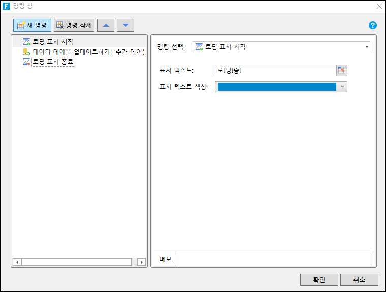 3. 명령창에서 "로딩 표시 시작" 명령을 선택하고 아래와 같이 설정합니다.&#x20;