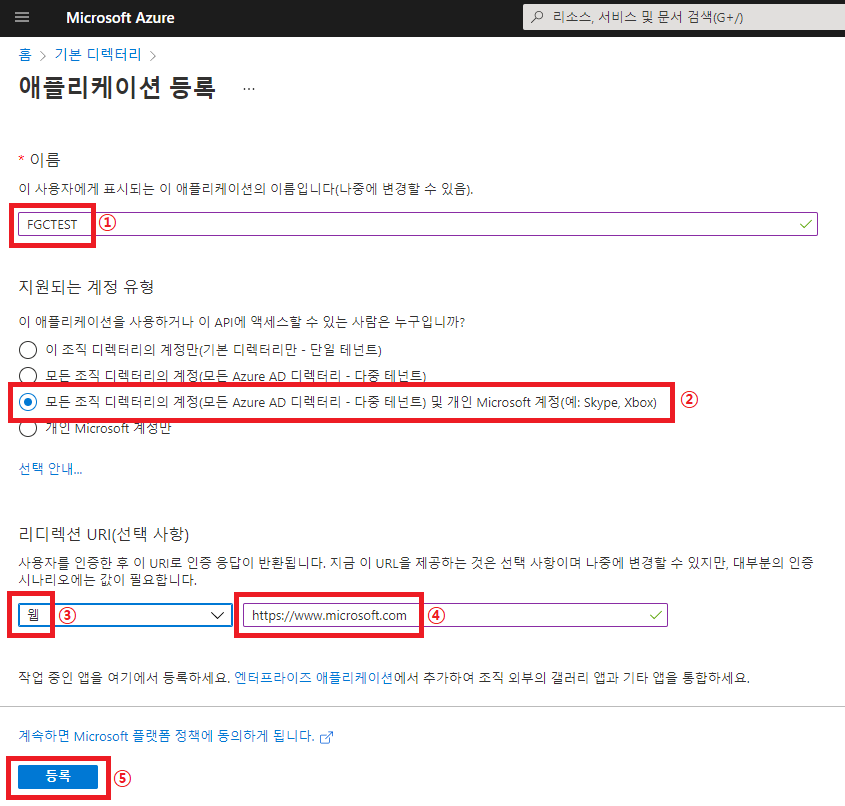 - 모든 조직 디렉터리의 계정(모든 Azure AD 디렉터리 - 다중 테넌트) 및 개인 Microsoft 계정(예: Skype, Xbox)
