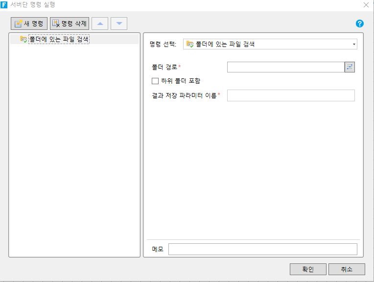 폴더 경로를 입력한 후, 결과 저장 파라미터 이름을 설정하고 명령을 수행하면 해당 폴더에 있는 파일을 검색할 수 있습니다. 검색 결과는 결과  저장 파라미터 이름에 저장됩니다.&#x20;